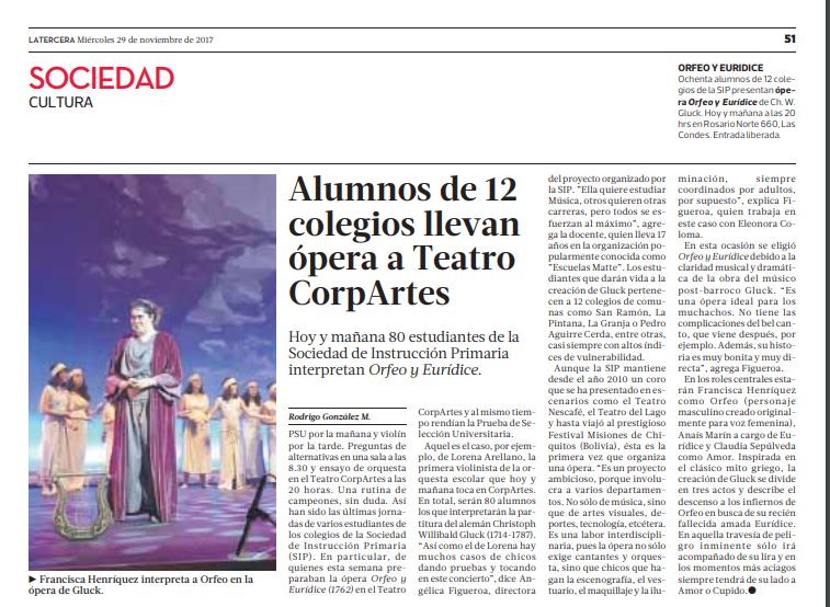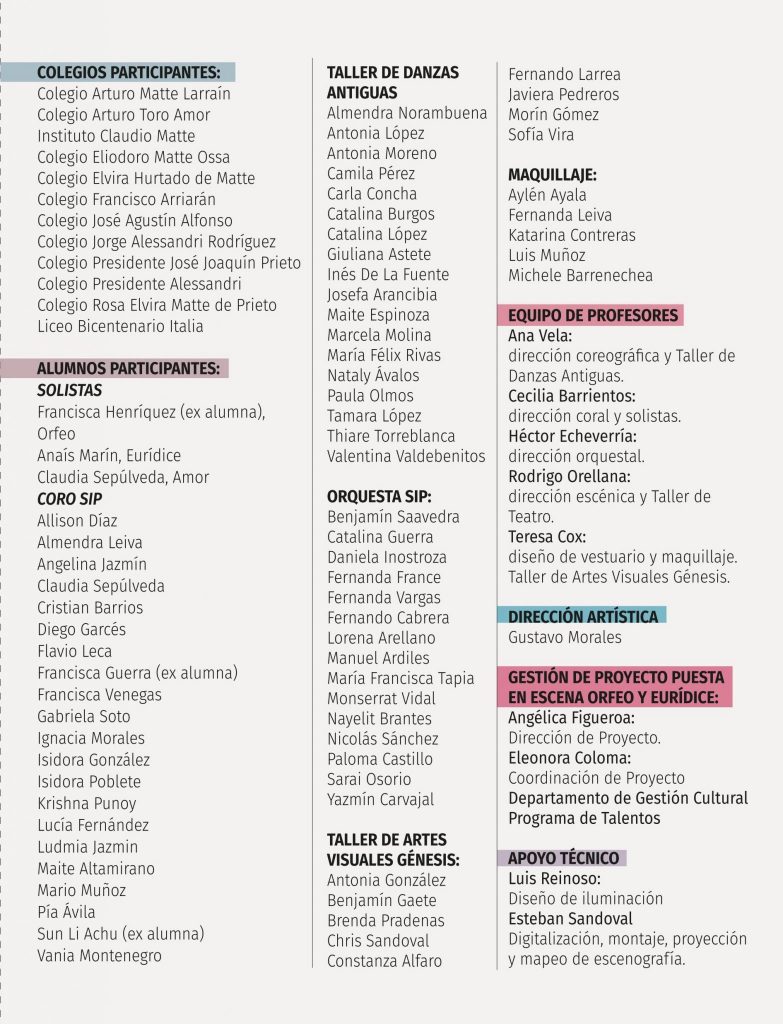 Alrededor de 1600 personas fueron testigos de la inédita puesta en escena de más de 80 alumnos de la SIP que durante dos años trabajaron la ópera barroca Orfeo y Eurídice y que el pasado 29 y 30 noviembre realizaron sus presentaciones llenando el Teatro CorpArtes.