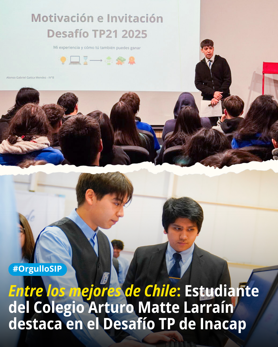 Alonso Gatica, estudiante de IVº Medio de la especialidad de Programación del Colegio Arturo Matte Larraín, logró quedarse con el 2º lugar en el Desafío TP21 2025 de Inacap. Este concurso reunió a más de 1.000 jóvenes de 56 colegios de todo Chile, y Alonso destacó entre 229 participantes de su área tras superar tres exigentes etapas.